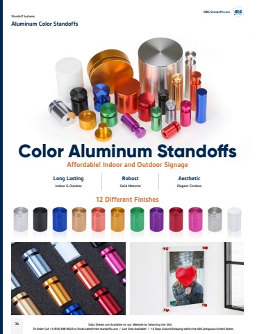 34 Data Sheets are Available on our Website by Selecting the SKUTo Order Call +1 (813) 938-6025 or Email sales@mbs-standoffs.com / Live Chat Available! / 1-3 Days Ground Shipping within the 48 Contiguous United StatesColor Aluminum StandoffsStandoff SystemsAluminum Color StandoffsAffordable! Indoor and Outdoor Signage12 Different FinishesIndoor & OutdoorLong LastingSolid MaterialRobustElegant FinishesAesthetic