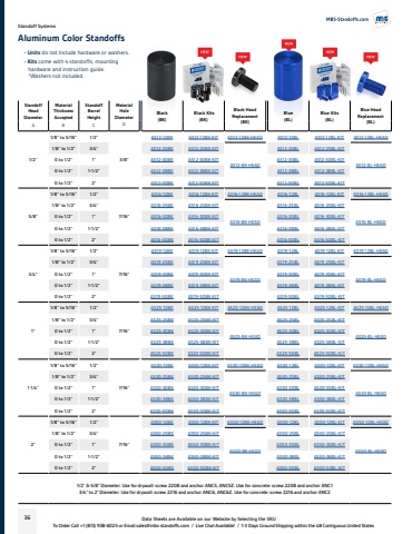 StandoffHeadDiameterMaterial Thickness AcceptedStandoffBarrelHeightMaterial Hole DiameterBlack (BK) Black Kits(BK)Black Head Replacement(BK)Blue (BL)Blue Kits(BL)Blue Head Replacement(BL) A B C D1/2''1/8'' to 5/16'' 1/2'' 3/8''AS12-12BK AS12-12BK-KIT AS12-12BK-HEAD AS12-12BL AS12-12BL-KIT AS12-12BL-HEAD1/8'' to 1/2'' 3/4'' AS12-25BK AS12-25BK-KITAS12-BK-HEADAS12-25BL AS12-25BL-KITAS12-BL-HEAD0 to 1/2'' 1'' AS12-30BK AS12-30BK-KIT AS12-30BL AS12-30BL-KIT0 to 1/2'' 1-1/2'' AS12-38BK AS12-38BK-KIT AS12-38BL AS12-38BL-KIT0 to 1/2'' 2'' AS12-50BK AS12-50BK-KIT AS12-50BL AS12-50BL-KIT5/8''1/8'' to 5/16'' 1/2'' 7/16''AS16-12BK AS16-12BK-KIT AS16-12BK-HEAD AS16-12BL AS16-12BL-KIT AS16-12BL-HEAD1/8'' to 1/2'' 3/4'' AS16-25BK AS16-25BK-KITAS16-BK-HEADAS16-25BL AS16-25BL-KITAS16-BL-HEAD0 to 1/2'' 1'' AS16-30BK AS16-30BK-KIT AS16-30BL AS16-30BL-KIT0 to 1/2'' 1-1/2'' AS16-38BK AS16-38BK-KIT AS16-38BL AS16-38BL-KIT0 to 1/2'' 2'' AS16-50BK AS16-50BK-KIT AS16-50BL AS16-50BL-KIT3/4''1/8'' to 5/16'' 1/2'' 7/16''AS19-12BK AS19-12BK-KIT AS19-12BK-HEAD AS19-12BL AS19-12BL-KIT AS19-12BL-HEAD1/8'' to 1/2'' 3/4'' AS19-25BK AS19-25BK-KITAS19-BK-HEADAS19-25BL AS19-25BL-KITAS19-BL-HEAD0 to 1/2'' 1'' AS19-30BK AS19-30BK-KIT AS19-30BL AS19-30BL-KIT0 to 1/2'' 1-1/2'' AS19-38BK AS19-38BK-KIT AS19-38BL AS19-38BL-KIT0 to 1/2'' 2'' AS19-50BK AS19-50BK-KIT AS19-50BL AS19-50BL-KIT1''1/8'' to 5/16'' 1/2'' 7/16''AS25-12BK AS25-12BK-KIT AS25-12BK-HEAD AS25-12BL AS25-12BL-KIT AS25-12BL-HEAD1/8'' to 1/2'' 3/4'' AS25-25BK AS25-25BK-KITAS25-BK-HEADAS25-25BL AS25-25BL-KITAS25-BL-HEAD0 to 1/2'' 1'' AS25-30BK AS25-30BK-KIT AS25-30BL AS25-30BL-KIT0 to 1/2'' 1-1/2'' AS25-38BK AS25-38BK-KIT AS25-38BL AS25-38BL-KIT0 to 1/2'' 2'' AS25-50BK AS25-50BK-KIT AS25-50BL AS25-50BL-KIT1-1/4''1/8'' to 5/16'' 1/2'' 7/16''AS30-12BK AS30-12BK-KIT AS30-12BK-HEAD AS30-12BL AS30-12BL-KIT AS30-12BL-HEAD1/8'' to 1/2'' 3/4'' AS30-25BK AS30-25BK-KITAS30-BK-HEADAS30-25BL AS30-25BL-KITAS30-BL-HEAD0 to 1/2'' 1'' AS30-30BK AS30-30BK-KIT AS30-30BL AS30-30BL-KIT0 to 1/2'' 1-1/2'' AS30-38BK AS30-38BK-KIT AS30-38BL AS30-38BL-KIT0 to 1/2'' 2'' AS30-50BK AS30-50BK-KIT AS30-50BL AS30-50BL-KIT2''1/8'' to 5/16'' 1/2'' 7/16''AS50-12BK AS50-12BK-KIT AS50-12BK-HEAD AS50-12BL AS50-12BL-KIT AS50-12BL-HEAD1/8'' to 1/2'' 3/4'' AS50-25BK AS50-25BK-KITAS50-BK-HEADAS50-25BL AS50-25BL-KITAS50-BL-HEAD0 to 1/2'' 1'' AS50-30BK AS50-30BK-KIT AS50-30BL AS50-30BL-KIT0 to 1/2'' 1-1/2'' AS50-38BK AS50-38BK-KIT AS50-38BL AS50-38BL-KIT0 to 1/2'' 2'' AS50-50BK AS50-50BK-KIT AS50-50BL AS50-50BL-KIT1/2\8 and anchor ANC13/4\ and anchor ANC236 Data Sheets are Available on our Website by Selecting the SKUTo Order Call +1 (813) 938-6025 or Email sales@mbs-standoffs.com / Live Chat Available! / 1-3 Days Ground Shipping within the 48 Contiguous United StatesStandoff SystemsAluminum Color Standoffs- Units do not Include hardware or washers.- Kits come with 4 standoffs, mounting  hardware and instruction guide. *Washers not included.