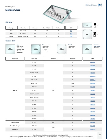 Data Sheets are Available on our Website by Selecting the SKUTo Order Call +1 (813) 938-6025 or Email sales@mbs-standoffs.com / Live Chat Available! / 1-3 Days Ground Shipping within the 48 Contiguous United States61TemperedGlass Shelves- No holesGlass Type Glass Size Thickness # of Holes SKUFlat (1)6'' x 6''0.16''4 200.3038'' x 8'' 4 200.3055'' x 5'' 4 200.3326-1/8'' x 3-1/8'' 2 250.0116'' x 4'' 2 250.013.A6'' x 3-1/8'' 2 250.029.A8-1/2'' x 11'' N/A 250.33017'' x 11'' N/A 250.36017'' x 11'' 4 250.36119-3/8'' x 13-3/8'' N/A 250.37019-3/8'' x 13-3/8'' 4 250.37110'' x 2'' 2 260.11012'' x 2'' 2 260.1208'' x 3'' 2 260.13010'' x 3'' 2 260.14012'' x 3'' 2 260.15012'' x 4'' 2 260.160Flat (2) Portrait 11'' x 17'' 0.16'' 2 250.284Flat (2) Landscape 17'' x 11''0.16''4 250.285Curved (2) 6'' x 6'' 4 210.303.QGlass Type Glass Size Diameter Barrel Height # of Holes SKUFlat 6'' x 3-1/8'' 1/2'' 2/3'' 2 FS1Flat 6'' x 3-1/8'' 1/2'' 1'' 2 FS3Curved 5-15/16'' x 5-15/16'' 1/2'' 1'' 4 FS17Flat- Sold by Unit- With holes - Without holes- Portrait- Landscape0.16''ThicknessFlat- Sold set of 2- With holes- Portrait- LandscapeCurved- Sold set of 2- With holes 0.16'' Thickness3/16'' Thicknessx 2x 4Full KitsGlasses Onlyx 2x 20.16'' ThicknessStandoff SystemsSignage Glass
