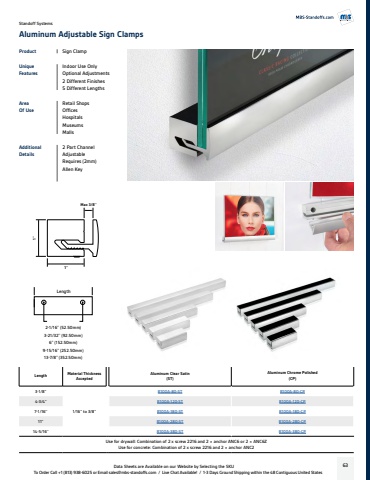Product Sign ClampUnique FeaturesIndoor Use OnlyOptional Adjustments2 Different Finishes5 Different LengthsArea Of UseRetail ShopsOfficesHospitalsMuseumsMallsAdditionalDetails2 Part Channel AdjustableRequires (2mm) Allen KeyData Sheets are Available on our Website by Selecting the SKUTo Order Call +1 (813) 938-6025 or Email sales@mbs-standoffs.com / Live Chat Available! / 1-3 Days Ground Shipping within the 48 Contiguous United States63Length Material Thickness AcceptedAluminum Clear Satin(ST)Aluminum Chrome Polished(CP)3-1/8''1/16'' to 3/8''R100A-80-ST R100A-80-CP4-3/4'' R100A-120-ST R100A-120-CP7-1/16'' R100A-180-ST R100A-180-CP11'' R100A-280-ST R100A-280-CP14-5/16'' R100A-380-ST R100A-380-CPUse for drywall: Combination of 2 x screw 2216 and 2 %u00d7 anchor ANC6 or 2 %u00d7 ANC6ZUse for concrete: Combination of 2 x screw 2216 and 2 %u00d7 anchor ANC22-1/16'' (52.50mm)3-21/32'' (92.50mm)6'' (152.50mm)9-15/16'' (252.50mm)13-7/8'' (352.50mm)LengthStandoff SystemsAluminum Adjustable Sign Clamps 1%u2019%u2019Max 3/8%u2019%u20191%u2019%u2019