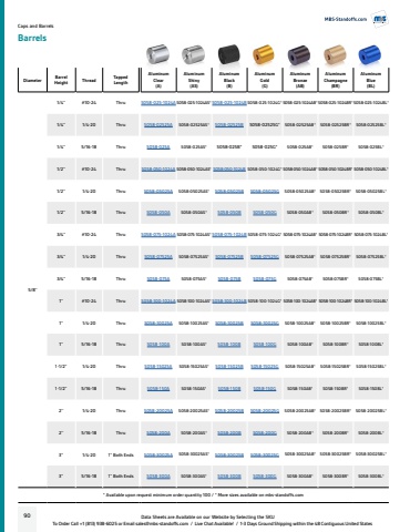 Diameter Barrel Height Thread Tapped LengthAluminum Clear(A)AluminumShiny(AS)AluminumBlack(B)AluminumGold(G)AluminumBronze(AB)AluminumChampagne(BR)AluminumBlue(BL)5/8''1/4'' #10-24 Thru S058-025-1024A S058-025-1024AS* S058-025-1024B S058-025-1024G* S058-025-1024AB* S058-025-1024BR* S058-025-1024BL*1/4'' 1/4-20 Thru S058-02525A S058-02525AS* S058-02525B S058-02525G* S058-02525AB* S058-02525BR* S058-02525BL*1/4'' 5/16-18 Thru S058-025A S058-025AS* S058-025B* S058-025G* S058-025AB* S058-025BR* S058-025BL*1/2'' #10-24 Thru S058-050-1024A S058-050-1024AS* S058-050-1024B S058-050-1024G* S058-050-1024AB* S058-050-1024BR* S058-050-1024BL*1/2'' 1/4-20 Thru S058-05025A S058-05025AS* S058-05025B S058-05025G S058-05025AB* S058-05025BR* S058-05025BL*1/2'' 5/16-18 Thru S058-050A S058-050AS* S058-050B S058-050G S058-050AB* S058-050BR* S058-050BL*3/4'' #10-24 Thru S058-075-1024A S058-075-1024AS* S058-075-1024B S058-075-1024G* S058-075-1024AB* S058-075-1024BR* S058-075-1024BL*3/4'' 1/4-20 Thru S058-07525A S058-07525AS* S058-07525B S058-07525G S058-07525AB* S058-07525BR* S058-07525BL*3/4'' 5/16-18 Thru S058-075A S058-075AS* S058-075B S058-075G S058-075AB* S058-075BR* S058-075BL*1'' #10-24 Thru S058-100-1024A S058-100-1024AS* S058-100-1024B S058-100-1024G* S058-100-1024AB* S058-100-1024BR* S058-100-1024BL*1'' 1/4-20 Thru S058-10025A S058-10025AS* S058-10025B S058-10025G S058-10025AB* S058-10025BR* S058-10025BL*1'' 5/16-18 Thru S058-100A S058-100AS* S058-100B S058-100G S058-100AB* S058-100BR* S058-100BL*1-1/2'' 1/4-20 Thru S058-15025A S058-15025AS* S058-15025B S058-15025G S058-15025AB* S058-15025BR* S058-15025BL*1-1/2'' 5/16-18 Thru S058-150A S058-150AS* S058-150B S058-150G S058-150AB* S058-150BR* S058-150BL*2'' 1/4-20 Thru S058-20025A S058-20025AS* S058-20025B S058-20025G S058-20025AB* S058-20025BR* S058-20025BL*2'' 5/16-18 Thru S058-200A S058-200AS* S058-200B S058-200G S058-200AB* S058-200BR* S058-200BL*3'' 1/4-20 1'' Both Ends S058-30025A S058-30025AS* S058-30025B S058-30025G S058-30025AB* S058-30025BR* S058-30025BL*3'' 5/16-18 1'' Both Ends S058-300A S058-300AS* S058-300B S058-300G S058-300AB* S058-300BR* S058-300BL** Available upon request minimum order quantity 100 / * More sizes available on mbs-standoffs.com90 Data Sheets are Available on our Website by Selecting the SKUTo Order Call +1 (813) 938-6025 or Email sales@mbs-standoffs.com / Live Chat Available! / 1-3 Days Ground Shipping within the 48 Contiguous United StatesCaps and BarrelsBarrels
