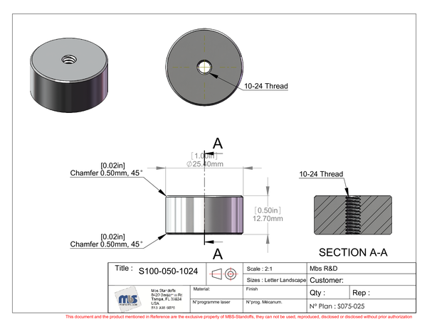 10-24 Threaded Barrels Diameter: 1'', Length: 1/2'', Black Anodized [Required Material Hole Size: 7/32'']