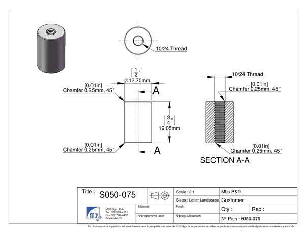 10-24 Threaded Barrels Diameter: 1/2'', Length: 3/4'', Clear Anodized Aluminum [Required Material Hole Size: 7/32'' ]