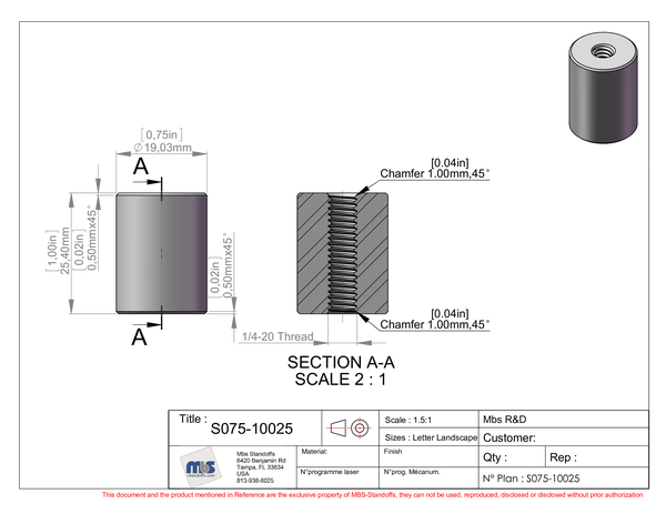 1/4-20 Threaded Barrels Diameter: 3/4'', Length: 1'', Clear Anodized [Required Material Hole Size: 17/64'' ]
