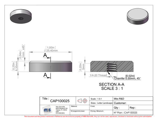 1/4-20 Threaded Caps Diameter: 1'', Height 1/4'', Gold Anodized Aluminum [Required Material Hole Size: 5/16'']