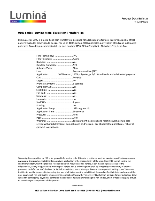 Lumina® 9106 Series is a metal flake heat transfer film designed for application to textiles. Features a special effect pattern that adds dimension to design. For use on 100% cotton, 100% polyester, poly/cotton blends, leather and sublimated polyester.