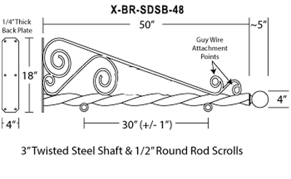 The Super Deluxe Scroll Bracket series is designed for heavy duty applications. This decorative wrought iron style sign bracket is hand-crafted from a twisted tubular shaft, creating a support shaft that is approximately 3 inches in thickness. Each bracket is adorned with classic 1/2” round rod scrolled ironwork and is topped off with a ornamental ball finial. It is designed to hang medium and heavy weight signs, such as steel and aluminum blanks, wood, PVC, HDU, ACP, MaxMetal, and large sized dimensional signage. This stylish swinging sign bracket compliments architecture found in historic districts, downtown shopping areas and even on the town square. Increased 4-inch width of the back plate and attachment points for guy wires provide for increased stability of your sign installation.
