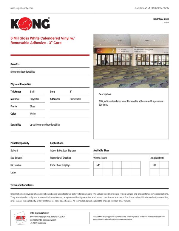 54'' x 100' Roll - 6 MIL Gloss White Calendered Vinyl w/ Permanent Adhesive - 3'' Core