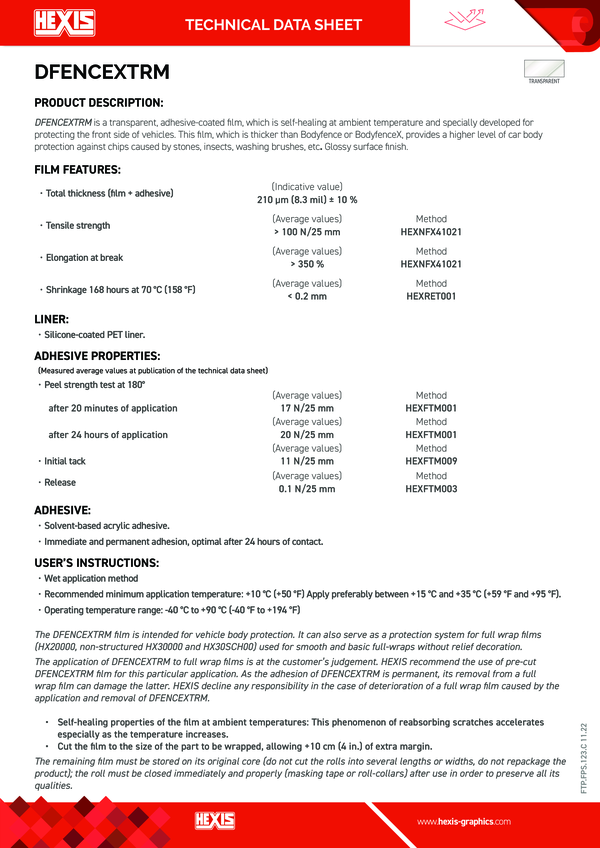 Hexis DFENCEXTRM is a transparent adhesive-coated film. This film is sealf-healing at ambient temperature. Specially developed for protecting the front side of vehicles