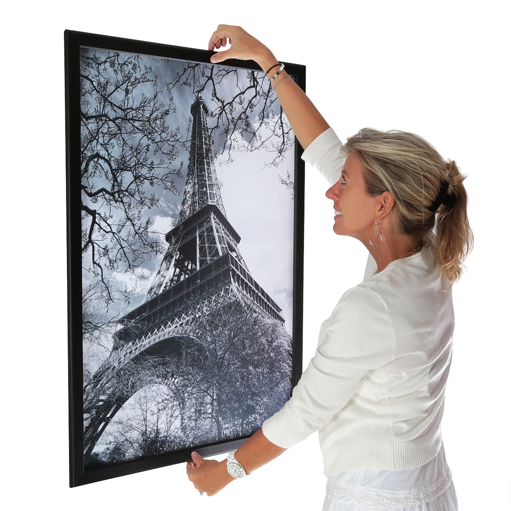 The classic easy to use snap frame has been around for years, but still offers the best value for money on the market for easy poster change.This Aluminum frame is made to the highest industry standards, the best quality available at the lowest price. Constructed of lightweight material, this snap frame is 1.25'' (32mm) thick and is made out of durable black anodized aluminum. This frame delivers multi functional usage and application options for everybody. Is front loading snap frame that can be used as picture frame, poster frame, wall sign, artwork, wall frame, notices, door sign, office door sign, etc. Posters are kept clean behind a resistant, anti-glare PVC front sheet. The snap frame can be mounted both portrait and landscape (vertical and horizontal) and comes ready with screws and holes for wall mounting. It can easily accommodate 22''x28'' media, offering a viewable surface of 21'' x 27''.