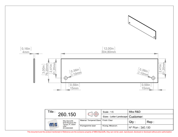 Flat Tempered Glass 12'' x 3'', 2 pre-drilled 3/8 holes