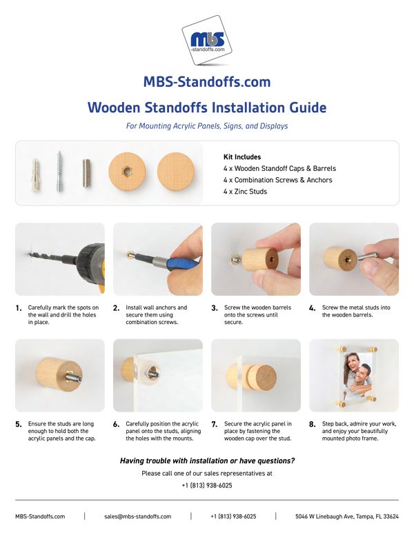 (Set of 4) 1'' Diameter X 1'' Barrel Length, Wooden Flat Head Standoffs, Matte Beech Wood Finish, Easy Fasten Standoff, Included Hardware (For Inside Use). Thickness Material Accepted: Between (0'' to 1/2'') Each includes: - (4) Cap 1'' Diameter X 3/8'' Height with Brass Insert 1/4-20 Thread - (4) Barrel 1'' Diameter X 1'' Height with Brass Insert 1/4-20 Thread - (4) 1/4-20 x 3/4'' Zinc Stud - (4) 1/4-20 x 1-1/2'' Hanger Bolt #6 - (4) Anchor #6 for Drywall or Concrete