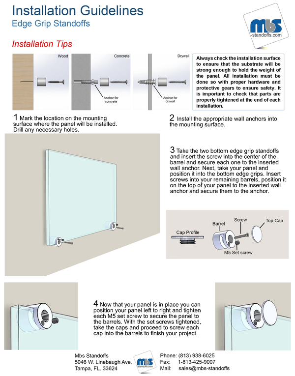 Our Fixed Edge Grips are the perfect solution without the need to drill holes in your material. The elegant finishes that we carry will give your display a unique look that will make it stand out like no other! This line of edge grips will make your project shine with the ability to hang up anything up to 5/16''. Thanks to the easy installation process you can have an exhibit displayed anywhere you would like in no time! If you look below you will notice technical descriptions about this particular standoff.